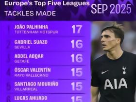 五大联赛九月份铲球榜:帕利尼亚17次居首,苏亚索16次第二