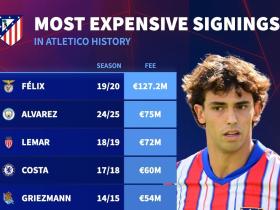 马竞队史最贵引援榜:菲利克斯1.272亿欧居首,小蜘蛛位居次席