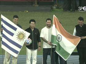 梅西抵达印度行第三站孟买,开球仪式前合影手拿印度国旗