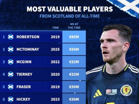 德转列苏格兰球员历史身价前10:罗伯逊8000万欧第1,小麦第2