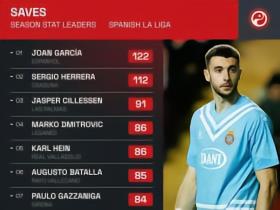 122次,霍安-加西亚是本赛季西甲截至目前扑救最多的门将