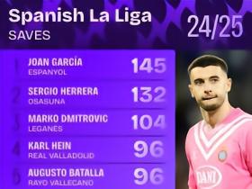 145次,霍安-加西亚是本赛季西甲扑救最多的门将
