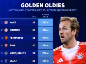 德转30岁以上球员身价榜:凯恩6500万第1,基米希、B费第2