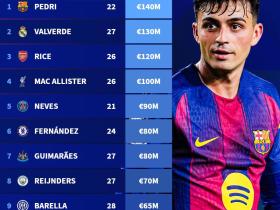 德转列中前卫身价榜:佩德里1.4亿欧居首,巴尔韦德第二