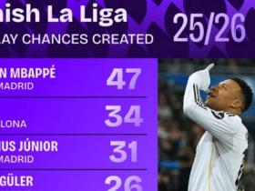 本赛季至今西甲运动战创造机会榜:姆巴佩居首,佩德里第二
