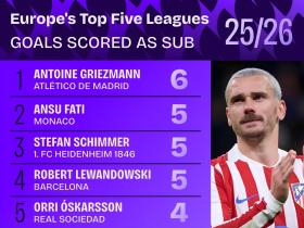 五大联赛替补射手榜:格列兹曼6球居首,莱万5球,谢什科4球