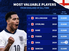 德转英格兰球员历史身价榜:贝林1.8亿欧第1,斯特林1.6亿第2