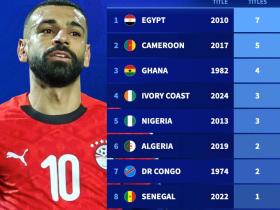 非洲杯夺冠与参赛次数排名:埃及7次夺冠26次参赛均位列第一