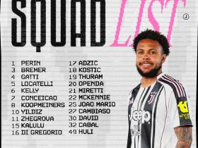 尤文战那不勒斯大名单:伊尔迪兹领衔,17岁门将胡利入选