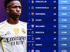 德转列左边锋身价榜:维尼修斯1.5亿欧居首,KK第二