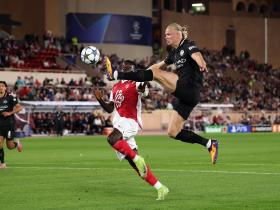 半场:曼城2-1摩纳哥,哈兰德双响,特泽世界波