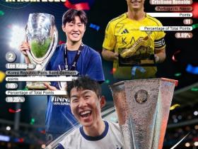 《体坛周报》2025亚洲金球奖:孙兴慜第10次夺魁,C罗第三名