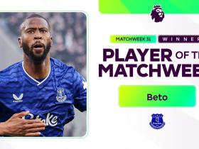 战切尔西两射一传,埃弗顿前锋贝托当选英超第31轮最佳球员