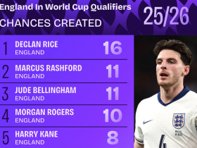 世预赛英格兰队内创造机会前10:赖斯第1、拉什福德、贝林第2