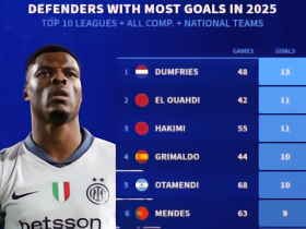德转列2025年欧洲前10联赛后卫进球榜:邓弗里斯13球第1