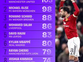 2025五大联赛创造机会排行榜:B费103次居首,奥利塞98次第二