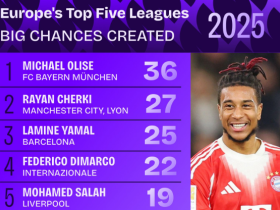 2025年五大联赛创造绝佳机会排行:奥利塞居首,谢尔基次席