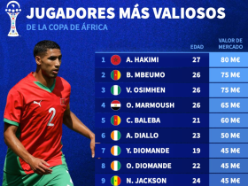 非洲杯球员身价榜:阿什拉夫8000万第1,姆伯莫、奥斯梅恩第2