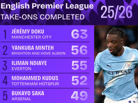 本赛季英超过人榜:多库63次第1,萨卡、内托、埃基蒂克上榜