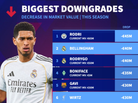 本赛季德转跌幅榜:罗德里跌4500万欧最高,贝林、罗德里戈第2