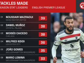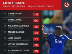 英超抢断榜:盖伊、穆尼奥斯、马兹拉维、凯塞多前四