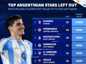此次未入选阿根廷队身价前10:小蜘蛛领先,马斯坦托诺在列
