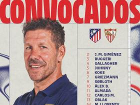 马竞对阵塞维利亚大名单:小蜘蛛领衔,巴里奥斯伤缺