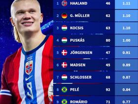 德转列国家队场均进球榜:哈兰德领跑,盖德-穆勒位列次席
