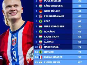 德转列国家队最快打入50球榜单:哈兰德第四,凯恩第十