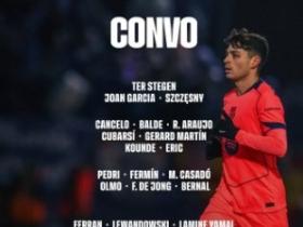 巴萨国王杯大名单:坎塞洛入选,亚马尔、莱万、拉菲尼亚在列