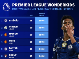 英超U21身价前10:埃斯特旺8000万第1,奥赖利、梅努、约罗第2