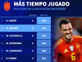 本届世预赛西班牙出场时间前10:梅里诺467分钟外场球员最多