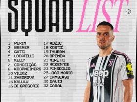 尤文战那不勒斯大名单:伊尔迪兹领衔,17岁门将胡利入选