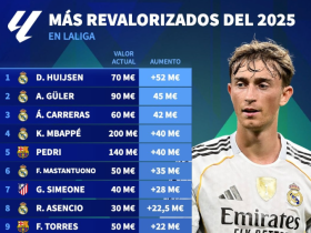 西甲2025年身价涨幅TOP15:赫伊森上涨5200万第1,姆巴佩第4