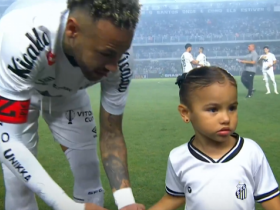 内马尔赛前牵着自己的女儿马维入场,之后还给女儿比心