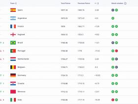 FIFA最新世界排名:西阿法英巴葡荷比德锁定世界杯种子队;中国仍居第93
