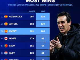 埃梅里接手维拉后181战100胜,同期英超主帅仅次于瓜帅和塔帅