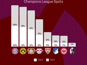 数据机构预测德甲前4名概率:拜仁100%,多特94%,勒沃库森83%