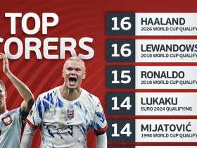 单届世欧预/欧预赛进球榜:哈兰德、莱万16球并列第一