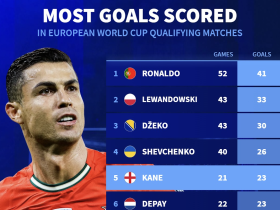 世欧预历史射手榜:C罗41球居首,凯恩第五,哈兰德第七