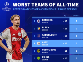 欧冠单赛季前5轮最差成绩TOP10:本赛季的贾府0分净负15球第4