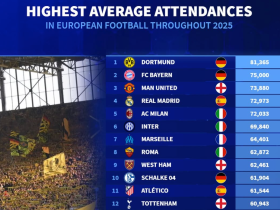 2025年欧洲俱乐部场均上座人数:多特、拜仁、曼联前三