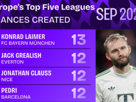 五大联赛9月创造机会榜:莱默尔第1,格10、佩德里紧随其后