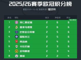 欧冠积分榜:6队两战全胜,拜仁领跑,卡拉巴赫第6