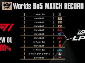 T1横扫TES后,对LPL的世界赛BO5连胜纪录扩大至12年13场