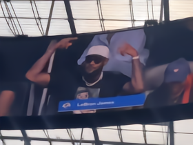 詹姆斯现场观战洛杉矶公羊,对镜头做出戴皇冠手势
