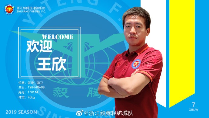 浙江毅腾足球俱乐部近日与王欣签订工作合同,王欣正式加盟浙江毅腾轻纺城队,将代表球队征战后半赛季中乙联赛。