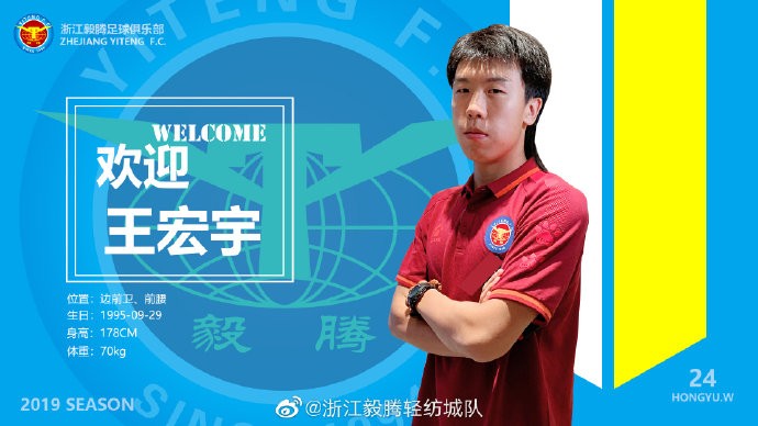 浙江毅腾足球俱乐部近日与石家庄永昌足球俱乐部经友好协商,就王宏宇租借事宜达成一致,王宏宇正式租借加盟浙江毅腾轻纺城队,将代表球队征战后半赛季中乙联赛。