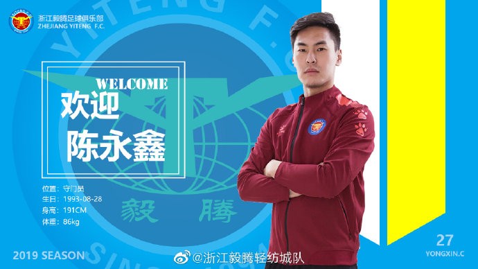 浙江毅腾足球俱乐部近日与陈永鑫签订工作合同,陈永鑫正式加盟浙江毅腾轻纺城队,将代表球队征战后半赛季中乙联赛。