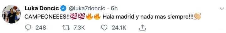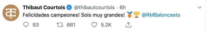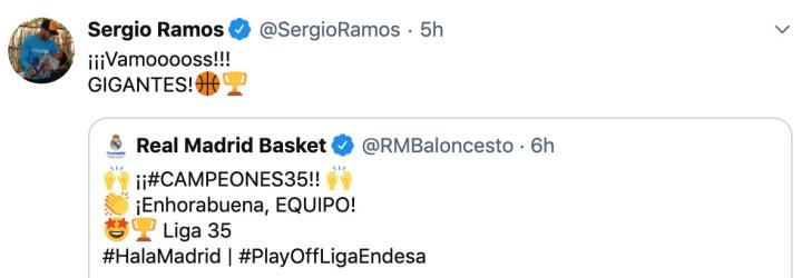 扫描下载懂球帝首页>动态> 皇马男篮3-1巴萨取队史第35个联赛冠军,足球队众将发推道贺